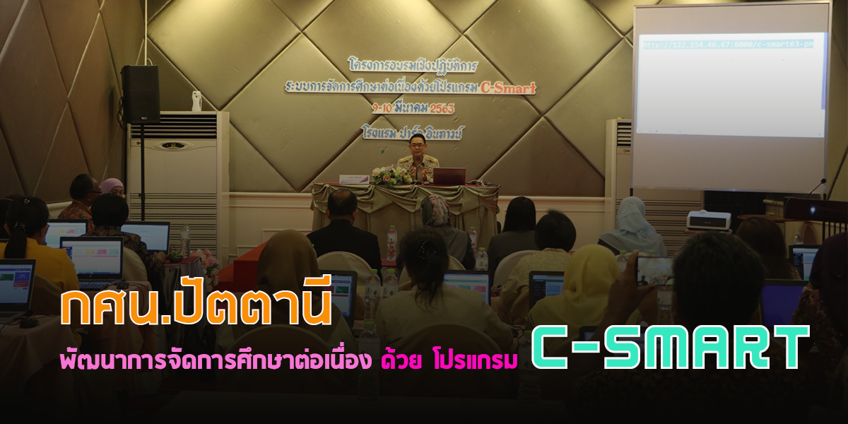 สำนักงาน กศน.จังหวัดปัตตานีจัดอบรมเชิงปฏิบัติการระบบการจัดการศึกษาต่อเนื่องด้วยโปรแกรม C-Smart เป็นหลักสูตรการอบรมเพื่อพัฒนาและปรับระบบวิธีการปฏิบัติราชการให้ทันสมัย บริหารจัดการบนข้อมูลและหลักฐานเชิงประจักษ์ นำนวัตกรรมและเทคโนโลยีระบบการทำงานที่เป็นดิจิทัล มาใช้งานการบริหารและการตัดสินใจ ซึ่ง C-SMART เป็นระบบช่วยเหลือการบริหารจัดการศึกษาต่อเนื่อง ทั้งในด้านข้อมูล กำกับ ติดตามและรายงานผลการจัดกิจกรรมในพื้นที่ซึ่งจะช่วยให้การจัดการศึกษาต่อเนื่องมีประสิทธิภาพมากยิ่งขึ้น