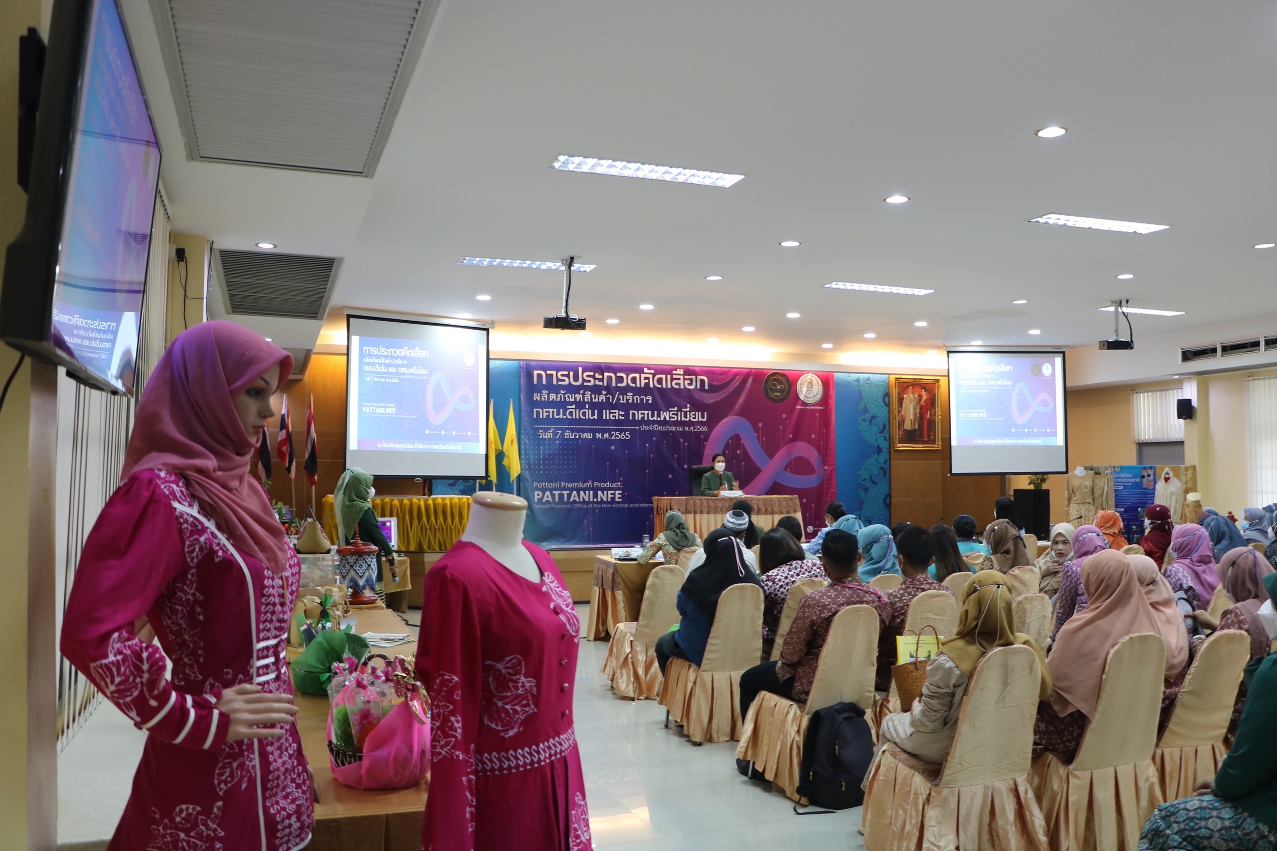 เมื่อวันที่ 7 ธันวาคม 2565 สำนักงาน กศน.จังหวัดปัตตานี จัดการประกวดคัดเลือกผลิตภัณฑ์สินค้า/บริการ กศน.ดีเด่น และกศน.พรีเมี่ยม ของสำนักงาน กศน.จังหวัดปัตตานี ประจำปีงบประมาณ 2566 ซึ่งเป็นการดำเนินการคัดเลือกผลิตภัณฑ์สินค้า/บริการ กศน. ดีเด่น และ กศน.พรีเมี่ยม ประจำปีงบประมาณ พ.ศ. 2566 โดยให้พิจารณาคัดเลือกจากการจัดกิจกรรมหลักสูตรฝึกทักษะอาชีพให้แก่ประชาชนกลุ่มเป้าหมายที่ประสบความสำเร็จ จากโครงการศูนย์ฝึกอาชีพชุมชน ประจำปีงบประมาณ พ.ศ. 2565 โดยคัดเลือกผลิตภัณฑ์สินค้า/บริการ กศน.ดีเด่น จำนวน 10 ผลิตภัณฑ์ และคัดเลือกผลิตภัณฑ์สินค้า/บริการ กศน.พรีเมี่ยม จากผลิตภัณฑ์สินค้า/บริการ กศน.ดีเด่น จำนวน 3 ผลิตภัณฑ์