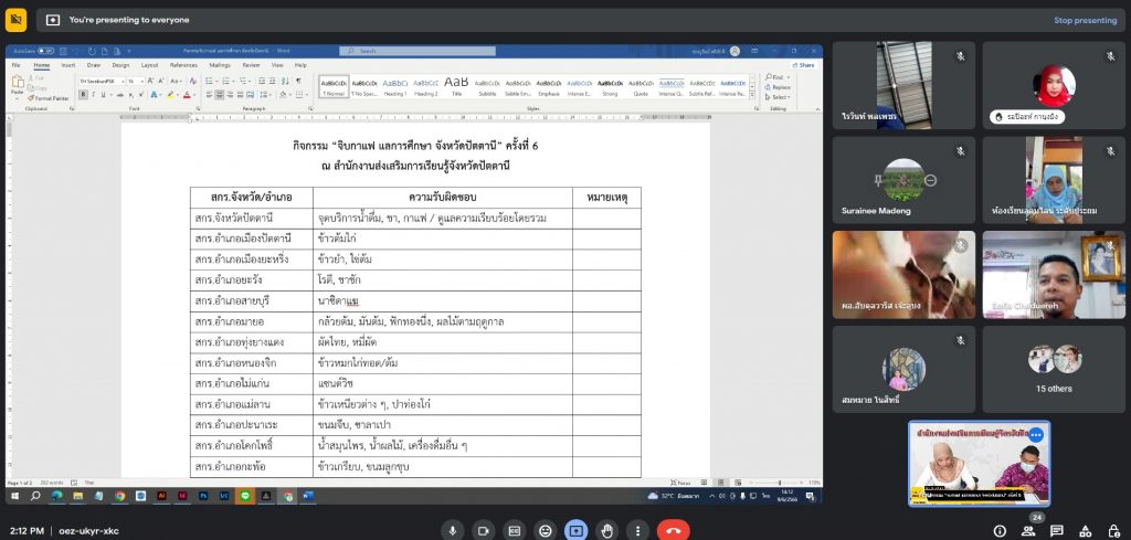 วันศุกร์ที่ 9 มิถุนายน พ.ศ. 2566 เวลา 14.00 น. สำนักงานส่งเสริมการเรียนรู้จังหวัดปัตตานี จัดการประชุมเตรียมความพร้อมการจัดกิจกรรม “จิบกาแฟ แลการศึกษา จังหวัดปัตตานี” ครั้งที่ 6 ณ สำนักงานส่งเสริมการเรียนรู้จังหวัดปัตตานี และ การประชุมเตรียมความพร้อมกิจกรรมวันต่อต้านยาเสพติดโลก (26 มิถุนายน) ประจำปี 2566 โดยมีนายอุดร สิทธิพาที ผู้อำนวยการสำนักงาน กศน.จังหวัดปัตตานี ปฏิบัติหน้าที่ผู้อำนวยการส่งเสริมการเรียนรู้จังหวัดปัตตานี ปฏิบัติราชการแทนอธิบดีกรมส่งเสริมการเรียนรู้ เป็นประธานการประชุม ผ่านระบบออนไลน์ Google Meet ณ ห้องปฏิบัติการเรียนรู้ออนไลน์ สำนักงานส่งเสริมการเรียนรู้จังหวัดปัตตานี