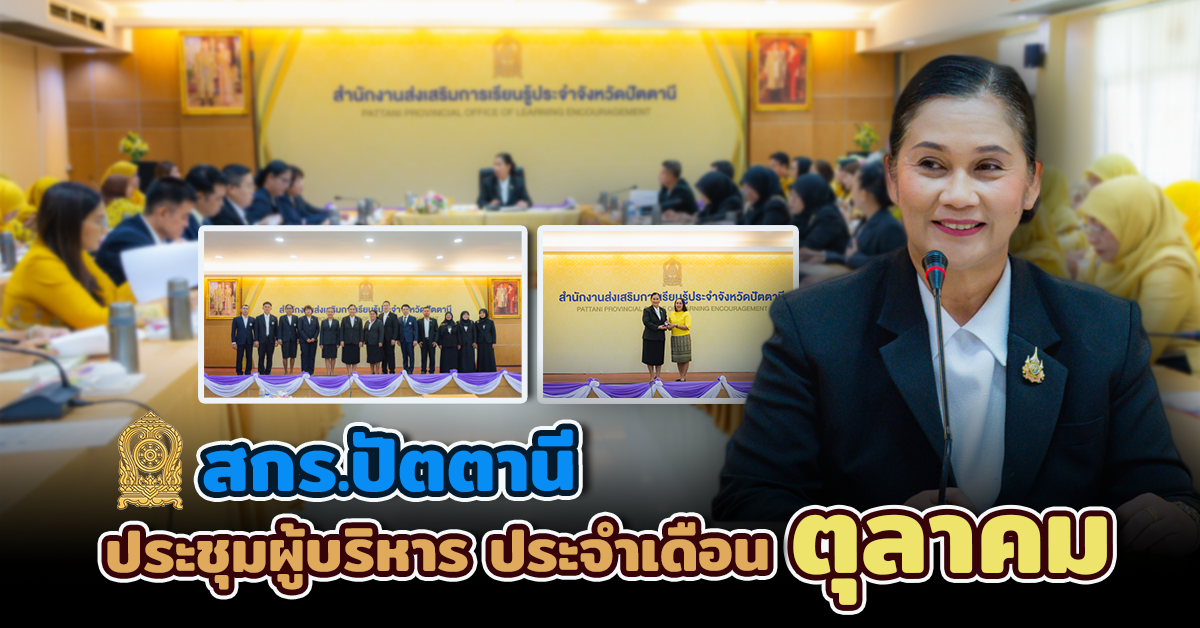 เมื่อวันศุกร์ ที่ 11 ตุลาคม พ.ศ. 2567 เวลา 09.00 น. สำนักงานส่งเสริมการเรียนรู้ประจำจังหวัดปัตตานี โดยกลุ่มงานอำนวยการ จัดการประชุมผู้บริหารและบุคลากร สังกัดสำนักงานส่งเสริมการเรียนรู้ประจังหวัดปัตตานี ประจำเดือนตุลาคม พ.ศ. 2567 ครั้งที่ 10/2567 โดยมี นางสุทิศา ซุ่นคง ผู้อำนวยการสำนักงานส่งเสริมการเรียนรู้ประจำจังหวัดปัตตานี เป็นประธานการประชุม มีผู้บริหารสถานศึกษา ครู บรรณารักษ์และบุคลากร สังกัดสำนักงานส่งเสริมการเรียนรู้ประจำจังหวัดปัตตานี เข้าร่วมประชุม ก่อนเริ่มวาระประชุม มีการมอบเของที่ระลึกแก่ผู้บริหาร ที่มารับตำแหน่งใหม่ และครูและบุคลากร ที่ได้รับเข็มเชิดชูเกียรติ ครู สกร. ประจำปี พ.ศ. 2567 ณ ห้องประชุมรูสะมิแล สำนักงานส่งเสริมการเรียนรู้จังหวัดปัตตานี