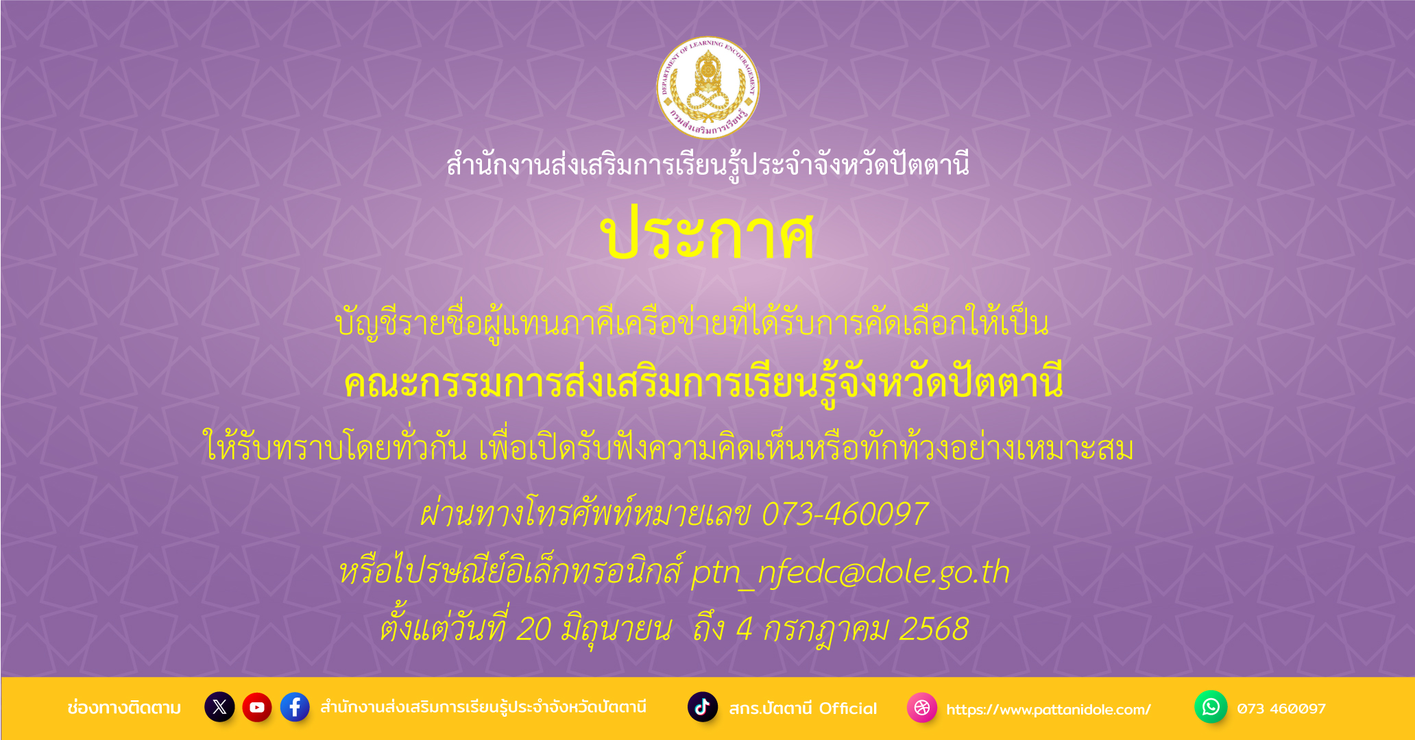 ขอประกาศบัญชีรายชื่อผู้แทนภาคีเครือข่ายที่ได้รับการคัดเลือกให้เป็นคณะกรรมการส่งเสริมการเรียนรู้จังหวัดปัตตานี