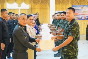 วันศุกร์ที่ 8 สิงหาคม พ.ศ. 2568 เวลา 14.30 น. นางสุทิศา ซุ่นคง ผู้อำนวยการสำนักงานส่งเสริมการเรียนรู้ประจำจังหวัดปัตตานี พร้อมด้วย นางสาวไซเราะ จะปะกิยา ผู้อำนวยการศูนย์ส่งเสริมการเรียนรู้ระดับอำเภอหนองจิก ร่วมเป็นเกียรติในพิธีปิดและมอบใบสำคัญผู้ผ่านการฝึกอบรมกิจกรรมการศึกษาเพื่อพัฒนาตนเอง หลักสูตรการล้างและบำรุงรักษาเครื่องปรับอากาศภายในบ้าน โดยมี พ.อ.(พ.)มานิตย์ เผ่าพงษ์จันทร์ รอง ผบ.พล.ร.15 เป็นประธานในพิธี และมี นางสุทิศา ซุ่นคง ผู้อำนวยการสำนักงานส่งเสริมการเรียนรู้ประจำจังหวัดปัตตานี กล่าวรายงาน และร่วมมอบใบสำคัญแก่นักศึกษากลุ่มเป้าหมายพิเศษ (ทหารกองประจำการ) ผู้ผ่านการฝึกอบรมดังกล่าว ณ ห้องประชุมเล็ก แหล่งสมาคมนายทหารสัญญาบัตร พล.ร.15 ค่ายสมเด็จพระสุริโยทัย ตำบลบ่อทอง อำเภอหนองจิก จังหวัดปัตตานี